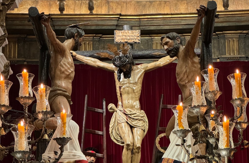 Imágenes: El Cristo de la Conversión del Buen Ladrón es obra de Juan de Mesa en 1620. María Magdalena es anónima del siglo XVIII. Los ladrones, Dimas y Gestas, son obra de Pedro Nieto en 1628. Nuestra Sra. de Montserrat es una talla anónima atribuida a Martínez Montañés o Gaspar de la Cueva.